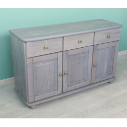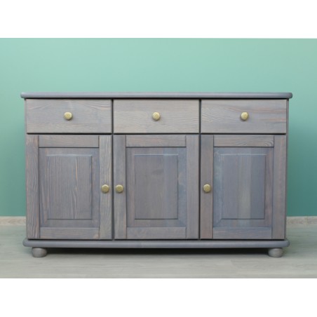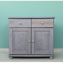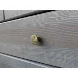 Komoda sosnowa K11 wykończona jest podwójną warstwą lakierobejcy w kolorze szarym, która podkreśla naturalną strukturę i barwę drewna sosnowego.