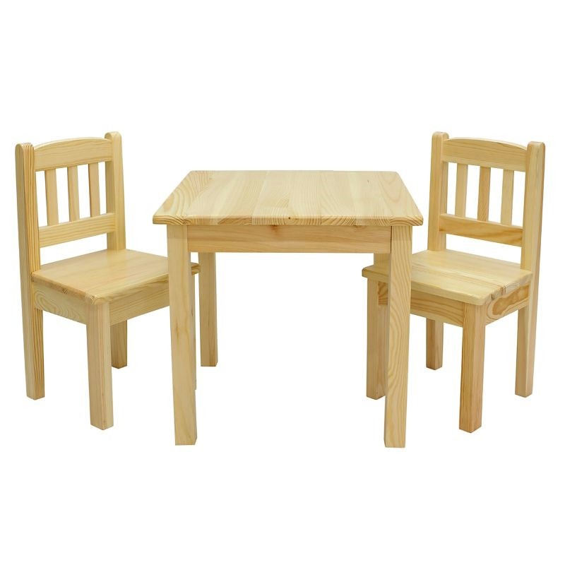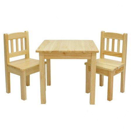 Kwadratowy drewniany stolik sosnowy 45x75 cm z krzesełkami dziecięcymi, wykonany w całości z litego drewna sosnowego.