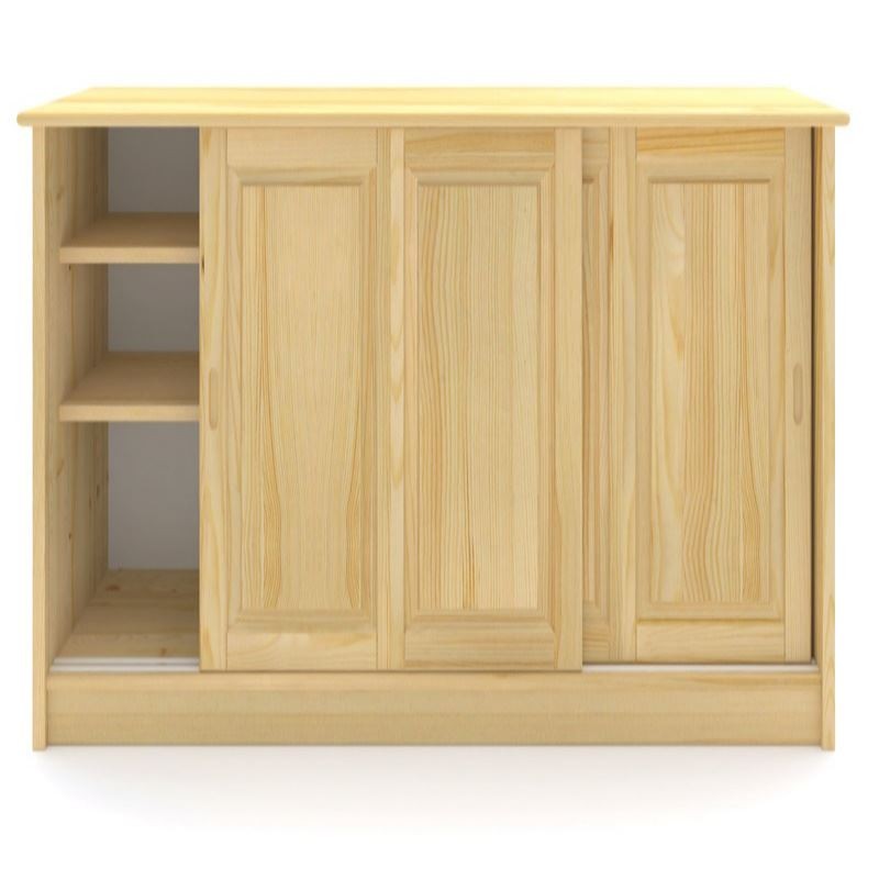 Duża drewniana szafka na buty wykonana z litego drewna sosnowego z przesuwnymi drzwiami i dwiema półkami.