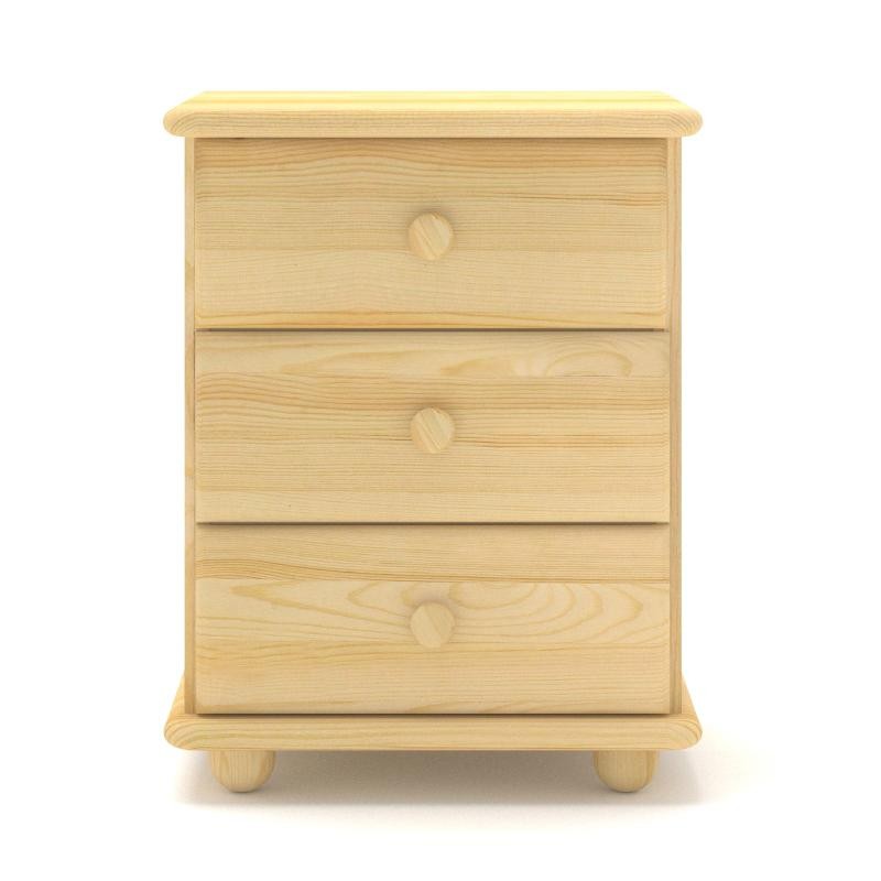 Klasyczna drewniana szafka nocna sosnowa wyposażona w trzy szuflady, wykonana z litego drewna sosnowego.