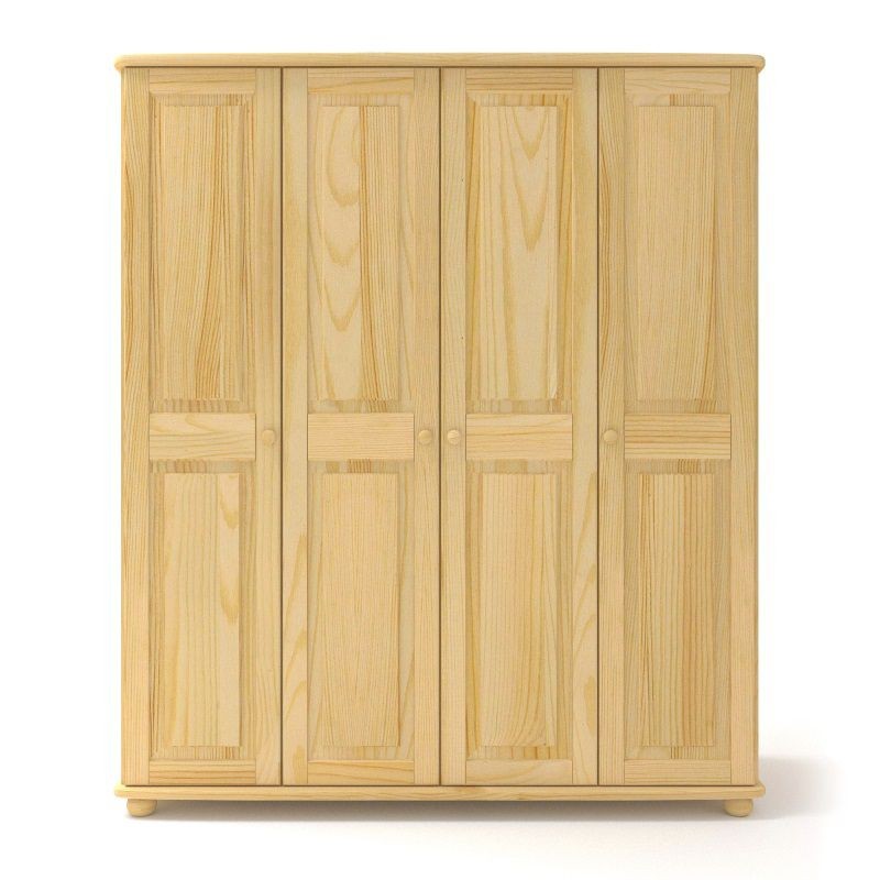 Klasyczna, 4-drzwiowa szafa sosnowa na ubrania z litego drewna sosnowego. Wyposażona w 6 półek oraz w drążek na wieszaki.