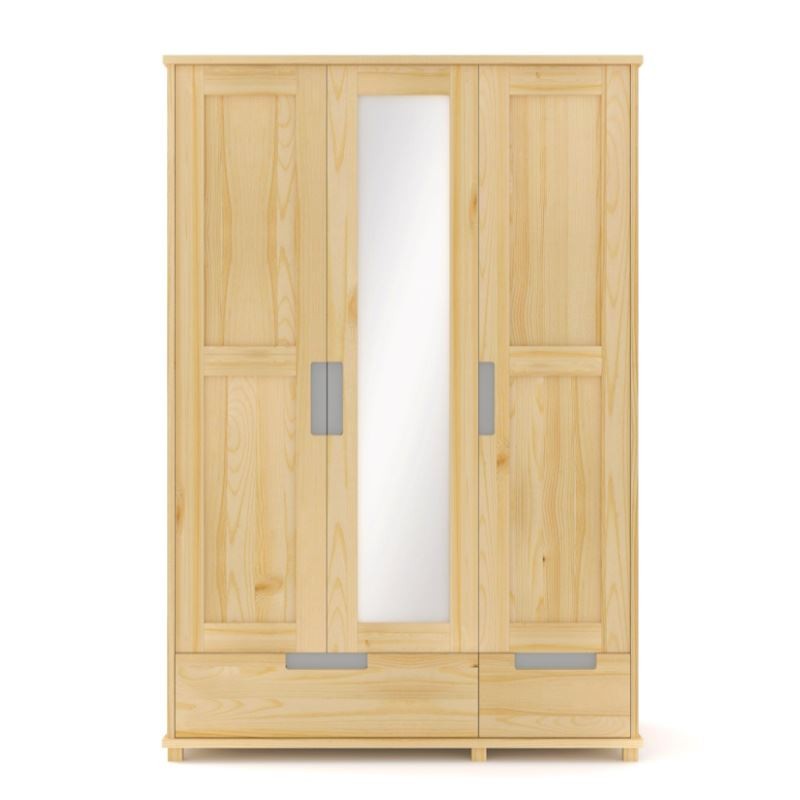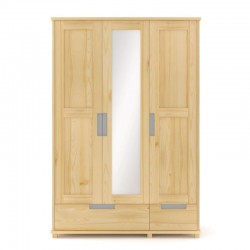 Nowoczesna drewniana szafa sosnowa z lustrem SF2ZL. Wnętrze szafy z drążkiem, półkami oraz szufladami, w trzech szerokościach do wyboru, wykonana z litego drewna sosnowego.