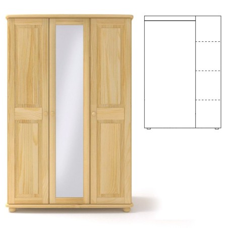 Klasyczna, 3-drzwiowa potrójna szafa sosnowa wyposażona w trzy półki na ubrania, drążek na wieszaki za podwójnymi drzwiami oraz lustro na środkowych drzwiach, wykonana z litego drewna sosnowego.