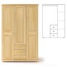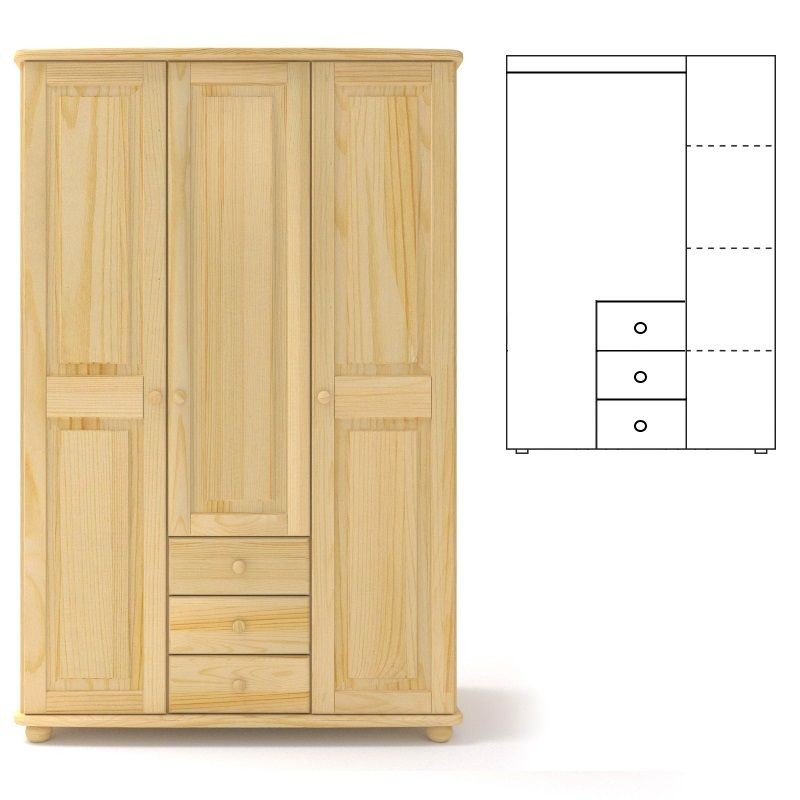 Klasyczna, 3-drzwiowa potrójna szafa sosnowa wyposażona w trzy półki na ubrania, drążek na wieszaki za podwójnymi drzwiami i trzy szuflady w środkowej części, wykonana z litego drewna sosnowego.