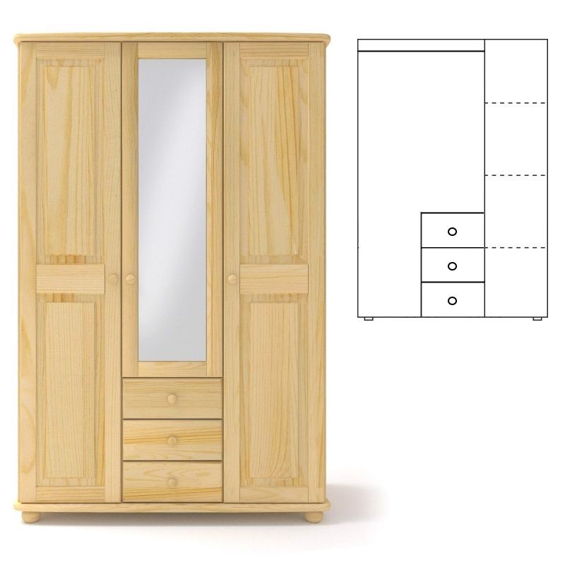 Klasyczna, 3-drzwiowa potrójna szafa sosnowa z lustrem, wyposażona w trzy półki na ubrania, drążek na wieszaki za podwójnymi drzwiami i trzy szuflady w środkowej części, wykonana z litego drewna sosnowego.