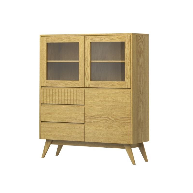 Nowoczesna duża i pojemna witryna dębowa na wysokich nóżkach, z szufladami oraz drzwiami przeszklonymi oraz pełnymi z półkami, wykonana z drewna dębowego.