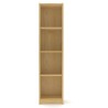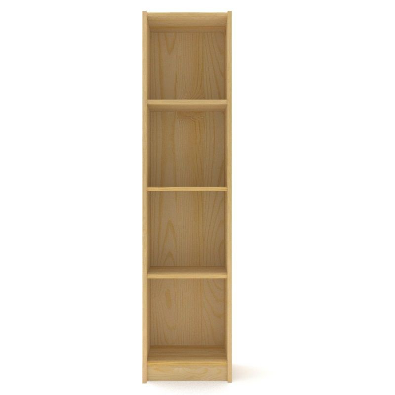 Wąski, prosty regał drewniany z litego drewna sosnowego z trzema półkami.