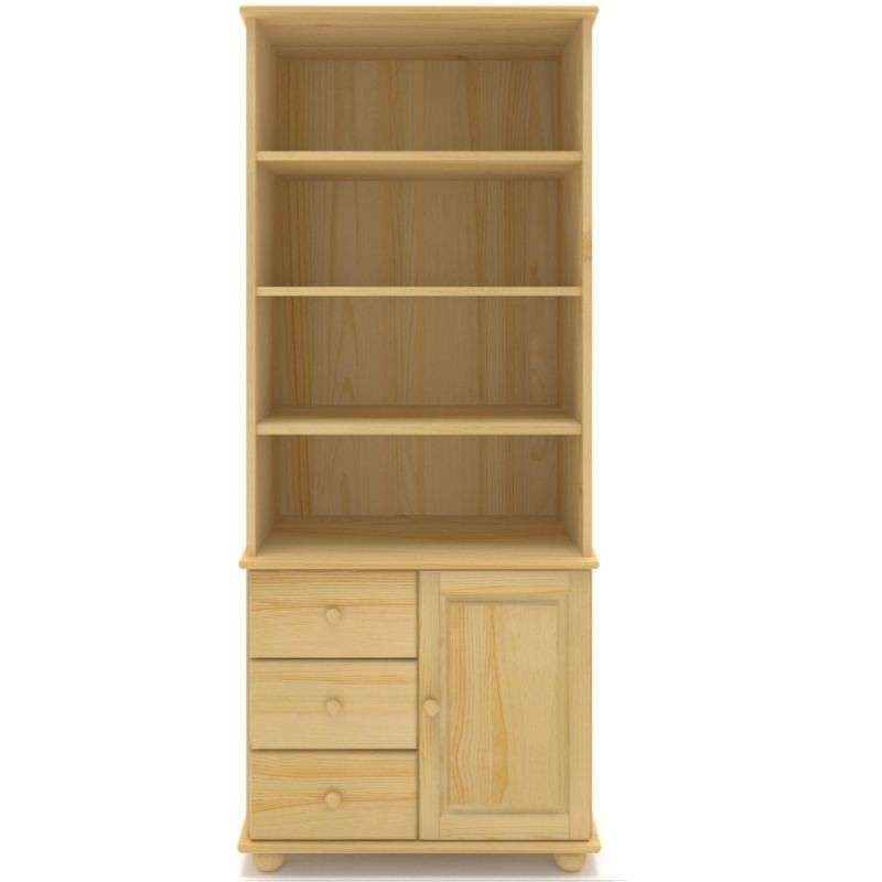 Pojemny regał wykonany z litego drewna sosnowego z trzema półkami, trzema szufladami i drzwiczkami.