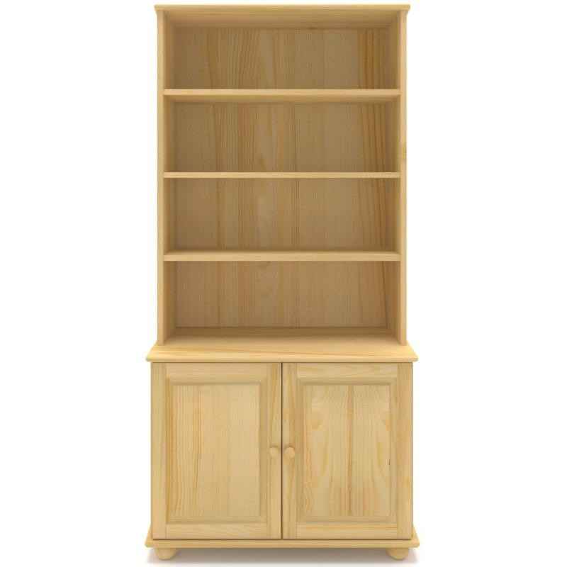 Duży drewniany regał z trzema półkami w górnej części oraz podwójnymi drzwiczkami, wykonany z litego drewna sosnowego.
