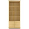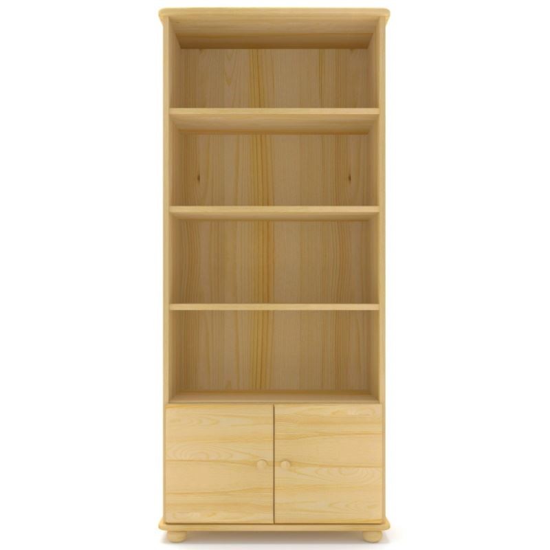 Klasyczny, szeroki drewniany regał z parą drzwiczek i półkami, wykonany z litego drewna sosnowego.