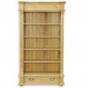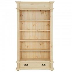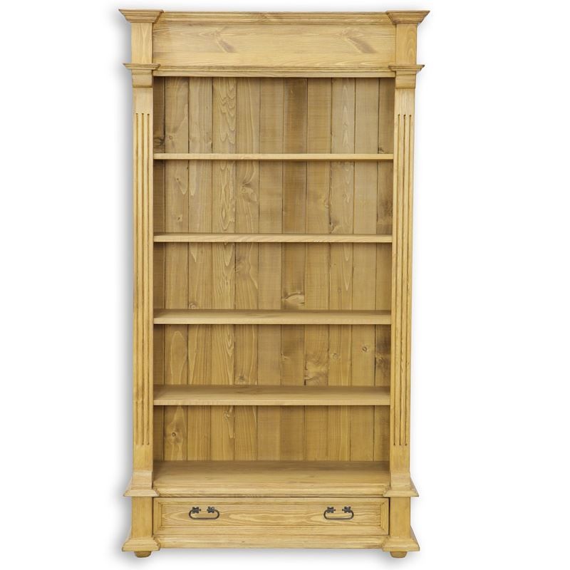 Podwójny woskowany masywny drewniany regał sosnowy z jedną szufladą i czterema półkami, wykonany z litego drewna sosnowego.