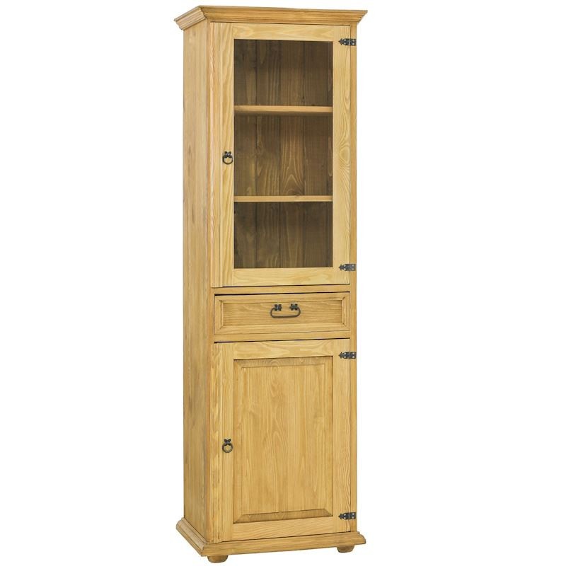 Pojedyncza woskowana witryna sosnowa z trzema półkami przedzielonymi jedną szufladą na środku, wykonana z litego drewna sosnowego.