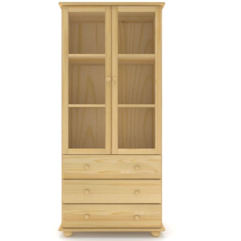 Drewniana podwójna, dwudrzwiowa witryna z przeszklonymi drzwiami i trzema dużymi szufladami, wykonana z litego drewna sosnowego.