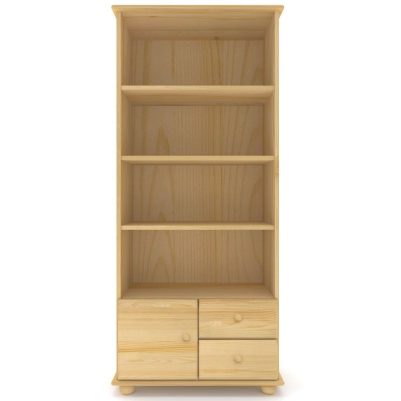 Drewniany regał z dwiema szufladami + drzwiczki w dolnej części i trzema otwartymi półkami, wykonany z litego drewna sosnowego.
