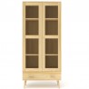 Nowoczesna drewniana podwójna, 2-drzwiowa witryna sosnowa na wysokich nóżkach, z przeszklonymi drzwiami i jedną szufladą, wykonana z litego drewna sosnowego.
