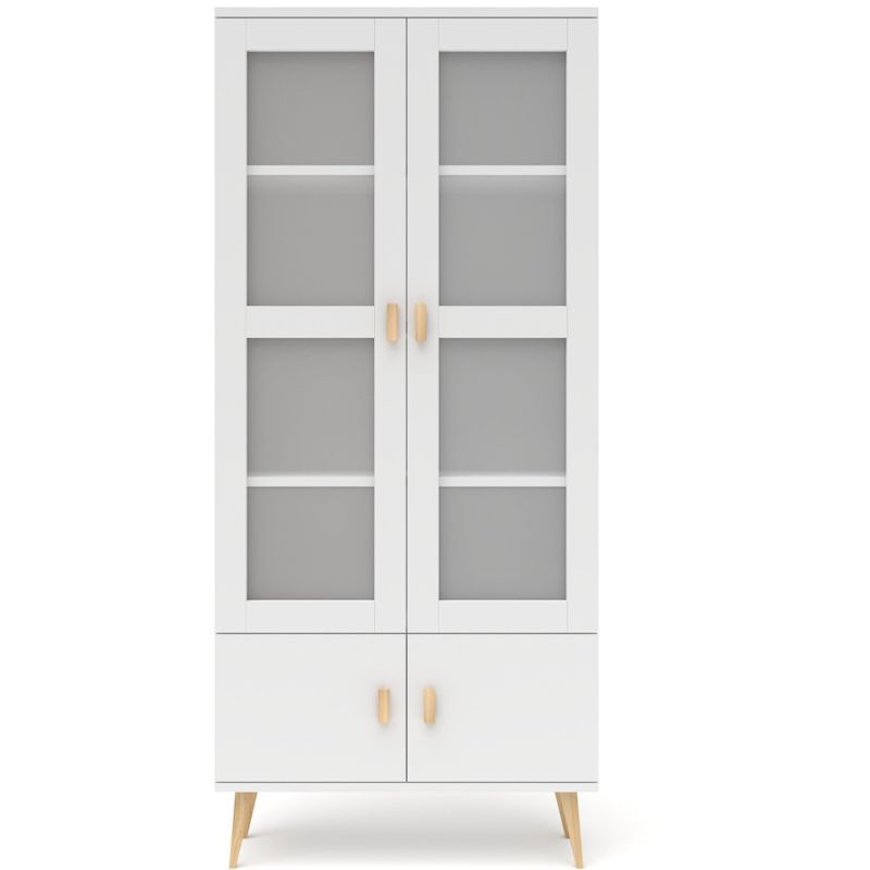 Nowoczesna biała drewniana podwójna, 2-drzwiowa witryna sosnowa na wysokich nóżkach, z przeszklonymi drzwiami i parą drzwiczek, wykonana z litego drewna sosnowego.
